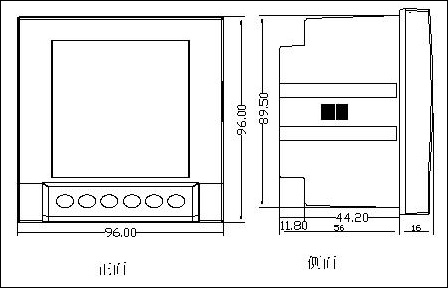 3、 性能指标(biao) --------------------------------------- ■精度等級:電流 電(dian)壓0.2級,功率0.5級,有功(gōng)電能1級 --------------------------------------- ■額定輸入(rù):電流5A 1A 電壓380V 100V頻率45Hz~60Hz ■過(guo)載能力:1.2倍/連續,10倍(bei)/1秒 -------------------------------------------------- ■ 開關量輸入:******9路(lù),内部提供電源或(huò)外部提供電源 ■ 繼(jì)電器輸出:1路,容量(liang)爲250Vac/5A,30Vdc/5A -------------------------------------------------- ■顯示:60*60 大液晶屏(ping)帶背光顯示 ■按鍵(jian):六按鍵,查詢和設(shè)置參數 -------------------------------------------------- ■通訊端口(kou):RS485通訊,MODBUS-RTU協議 ■波特率(lǜ):2400~19200bps ---------------------------------------- ■工作電源:85~265VAC 100~300VDC ■整機功(gōng)耗:<3VA --------------------------------------- ■工頻耐壓:輸入(rù)-電源 AC2kV/1min ■絕緣電阻:>50MΩ ■沖(chòng)擊電壓:5kV(峰值),1.2/50uS ---------------------------------------- ■快速(su)脈沖群抗擾度:GB/T 17626.4(IEC61000-4-4) Level 3 ■浪(làng)湧抗擾度:GB/T 17626.5(IEC61000-4-5) Level 3 ■靜電抗(kàng)擾度:GB/T 17626.2(IEC61000-4-2) Level 3 ---------------------------------------- ■工作溫度:-20~70℃ ■存(cún)儲溫度:-40~80℃ ■相對濕度(du):5~95%RH,無凝露 ----------------------------------------