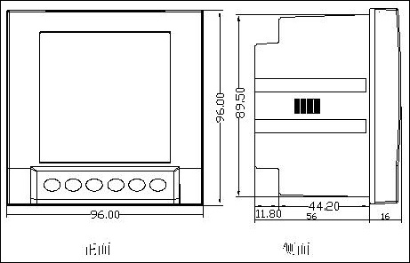 3、性能指标 ------------------------------------------------------- ■精度(du)等級:電流、電壓0.5級(ji),功率0.5級,有功電度(du)1級 ------------------------------------------------------- ■額定輸入:電流(liu)5A、1A,電壓380V、100V ,頻率45Hz~60Hz ■過載能(neng)力:電流、電壓1.2倍/連(lián)續,電流10倍/1秒 ------------------------------------------------------- ■開關(guan)量輸入:******4路,内部提(tí)供電源或外部提(tí)供電源 ■繼電器輸(shū)出:******2路,控制方式爲(wei)自控或遙控,容量(liang)爲250Vac/5A,30Vdc/5A -------------------------------------------------- ■模拟量輸出:1路(lu)4~20mA輸出,内部有源,輸(shū)出負載爲500歐姆 -------------------------------------------------- ■顯(xian)示:高亮度數碼管(guan)顯示 ■按鍵:六按鍵(jian),查詢和設置參數(shù) -------------------------------------------------- ■通訊端口:1路RS485通訊(xun),MODBUS-RTU協議,波特率爲2400~19200bps ---------------------------------------- ■工(gōng)作電源:85~265VAC 100~300VDC ■整機功耗(hao):<5VA ■工頻耐壓:輸入-輸(shū)出-電源 AC2kV/1min ■絕緣電阻(zu):>50MΩ ■沖擊電壓:5kV(峰值),1.2/50uS ---------------------------------------- ■快(kuài)速脈沖群抗擾度(du): GB/T 17626.4(IEC61000-4-4) Level 3 ■浪湧抗擾度: GB/T 17626.5(IEC61000-4-5) Level 3 ■靜電(diàn)抗擾度: GB/T 17626.2(IEC61000-4-2) Level 3 ---------------------------------------- ■工作溫度(du):-20~70℃ ■存儲溫度:-40~80℃ ■相對濕(shi)度:5~95%RH,無凝露 ----------------------------------------