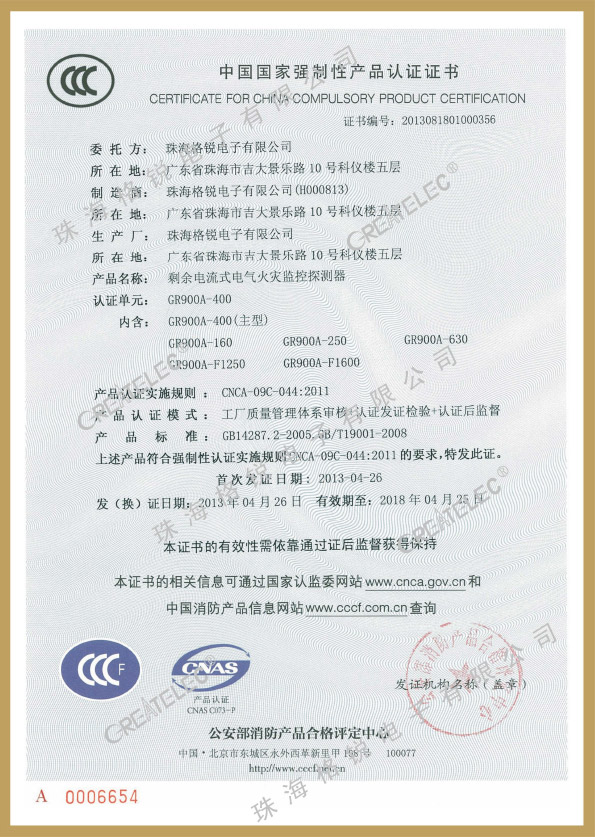 當前位置(zhi): 公司資質(zhi) 型式檢驗(yan)報告/3C證書(shu) > 電氣火災(zai)3C證書